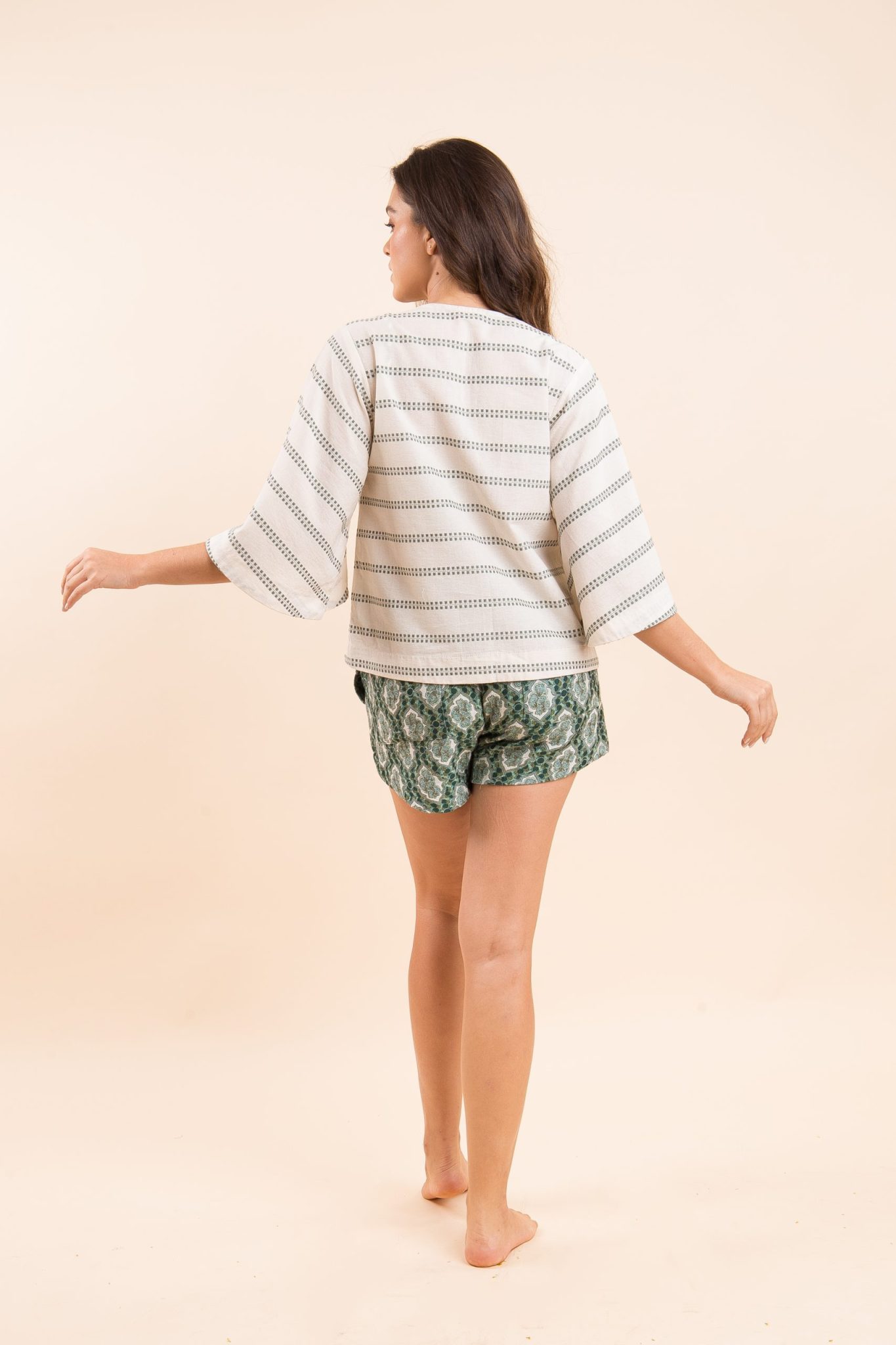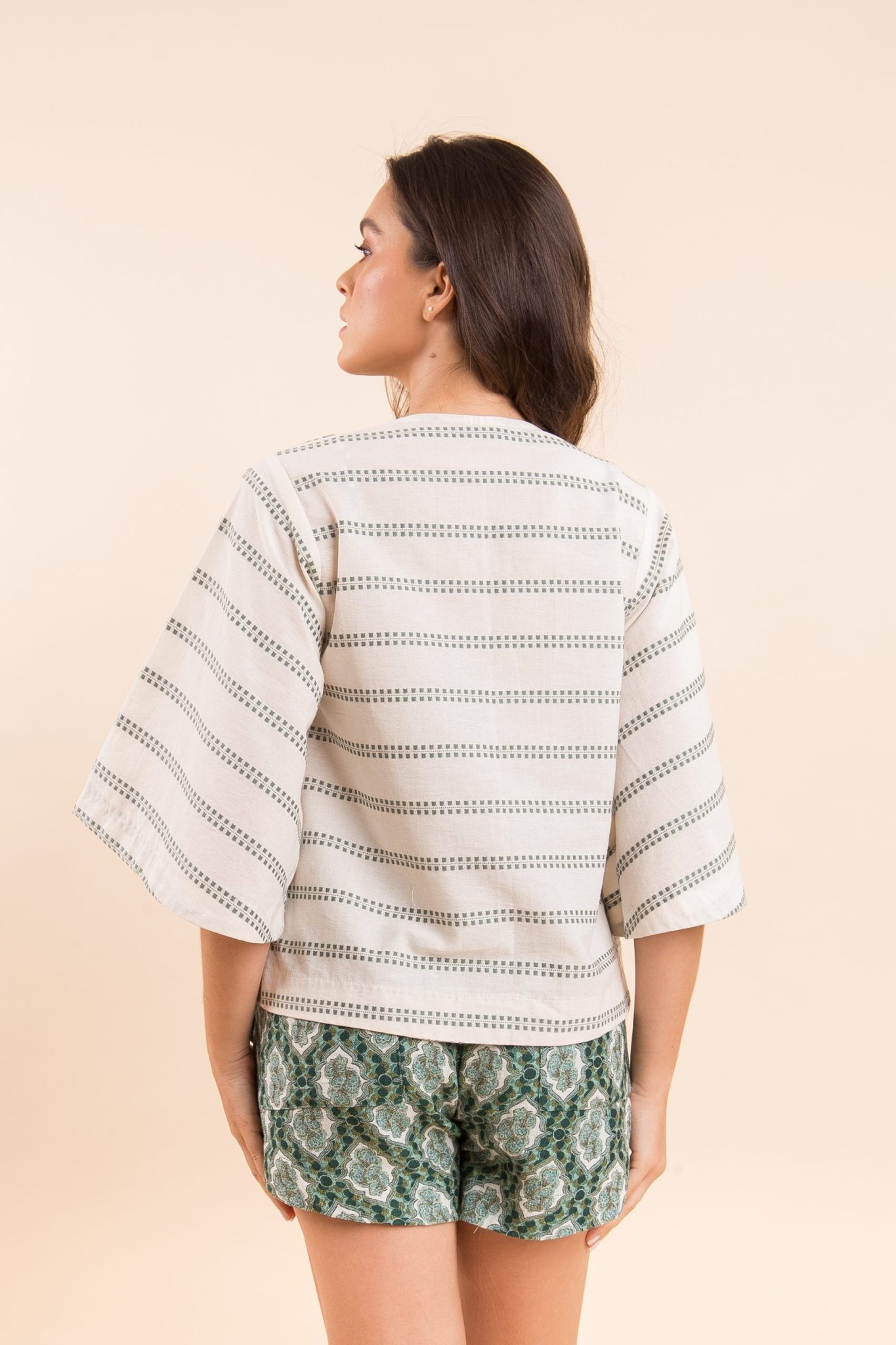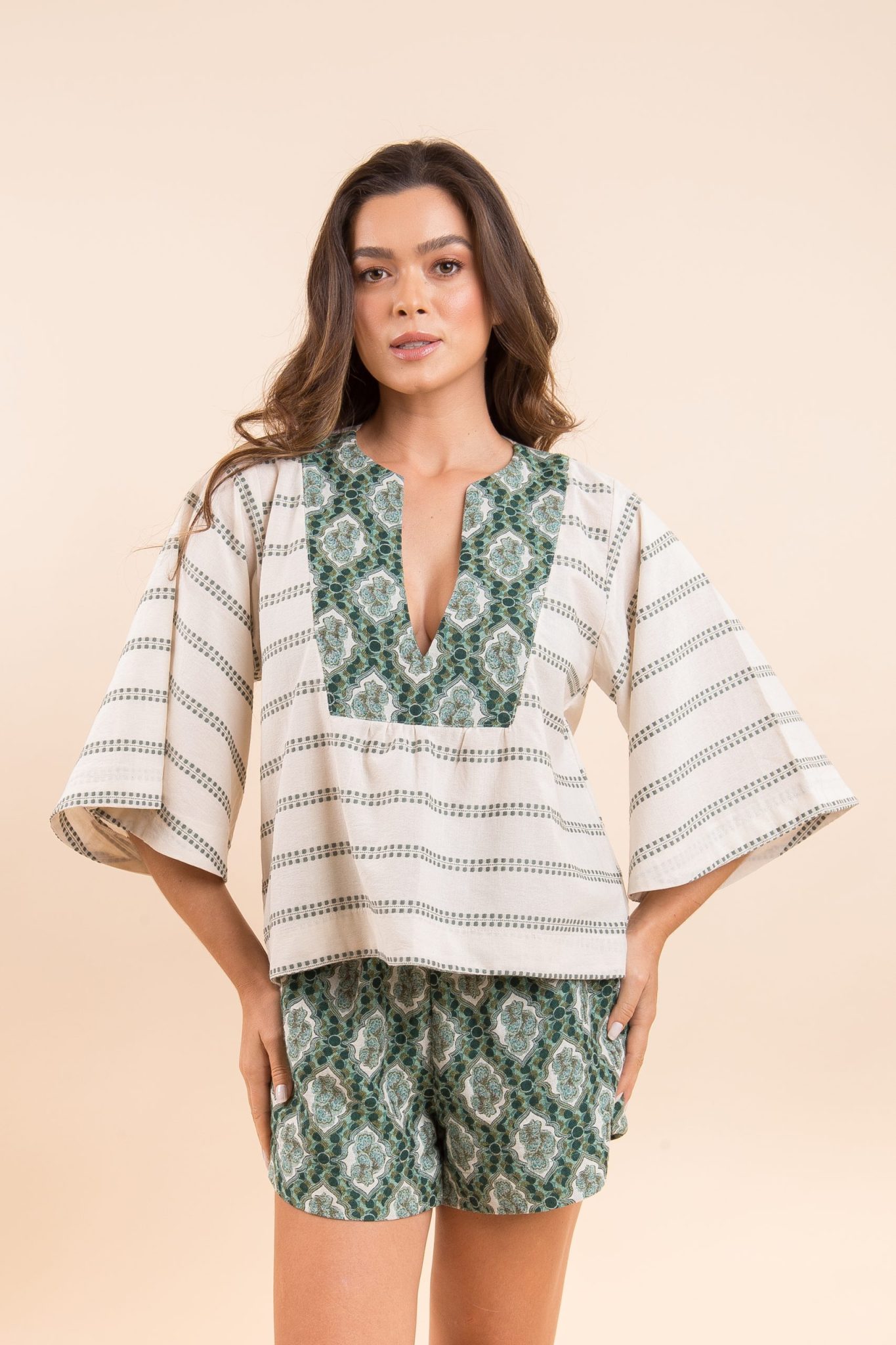 Decote em V, com bordado na pala em Jacquard e mangas amplas.