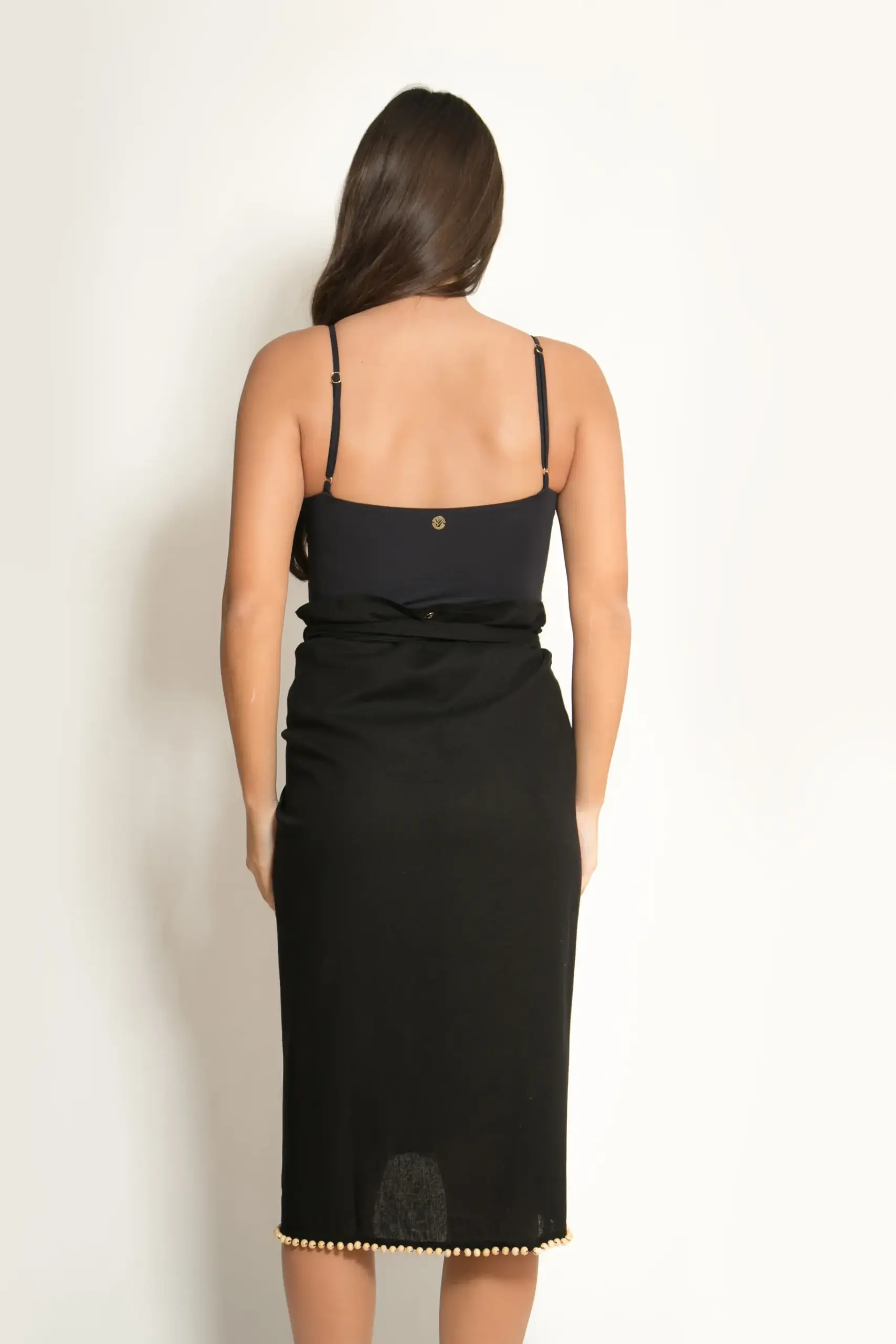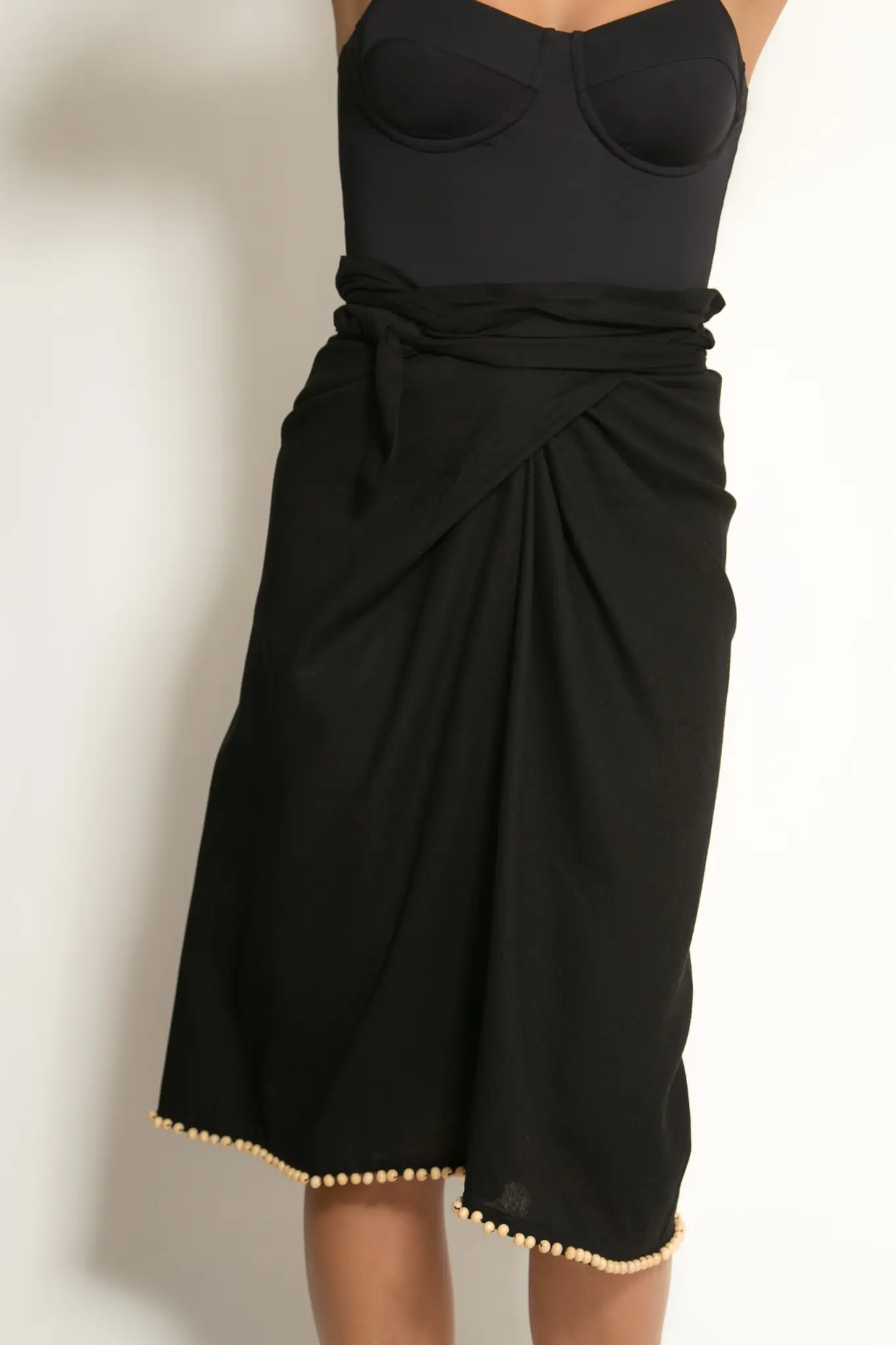 Saia midi, em viscose com linho, com amarração lateral ou atras, bordada à mão, na barra, com contas de madeira.